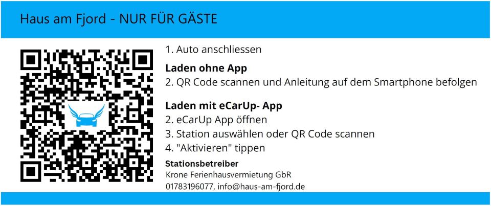 Am haus-eigenen Parkplatz steht Gästen eine Wallbox zur Verfügung. Einfach das Kabel anstecken, den QR-Code scannen und per Kreditkarte laden.